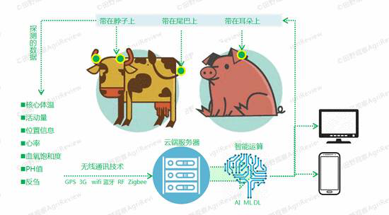 再把這些信息實時的發送到農場管理人員的智能手機或者電腦上,亦或者發送到牲畜的智能穿戴設備上。
